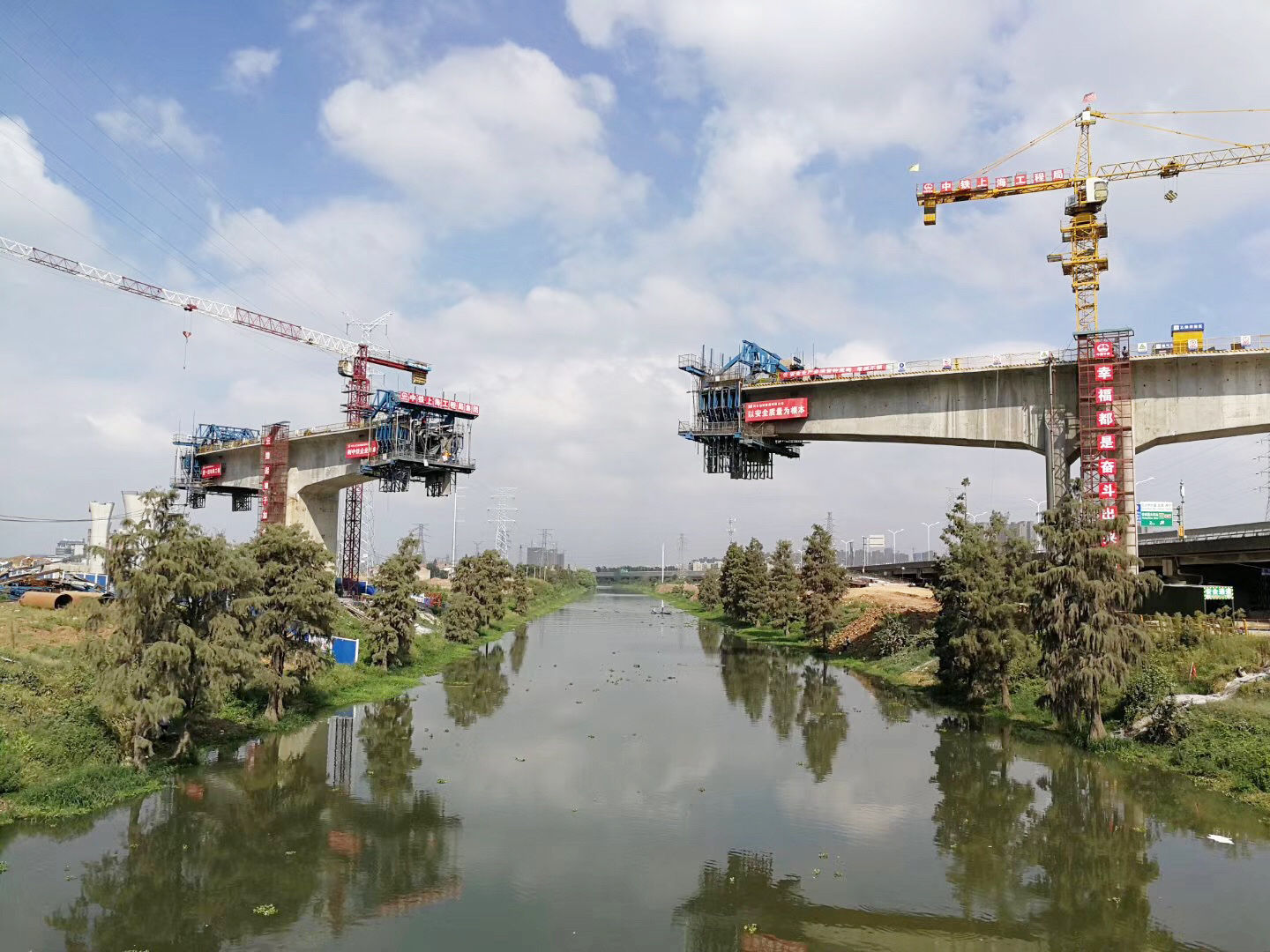 作為備受武漢百姓關注的工程,該標段面臨著管線改遷難度大、地質條件差、掛籃難度高的難題。針對管線遷難題,項目部通過組織對管線進行詳細調查,制定了管線遷改方案,協助業主推動管線遷改,還針對110kv和220kv架空高壓走廊交叉和并行施工的情況,制定了高壓走廊安全防護方案,組織專業人員進行防護設施安裝,安排專人值守進行重點防控,有效推進管線改遷。由于該地區是巖溶地質,項目部采用“一樁一鉆”辦法實現樁位勘察全覆蓋,編制了巖溶專項施工方案,組織有區域內巖溶處理經驗豐富的協作隊伍進行施工,并在過程中加強監測,有效化解熔巖地質施工難題。針對小半徑曲線掛籃施工,項目部通過建立三維模型進行理論計算分析,采用“應力—應變”雙向控制的方法進行全過程管控,并安排專業監控量測隊伍對懸臂掛籃法連續梁進行監測,成功攻克了曲線掛籃施工難題。