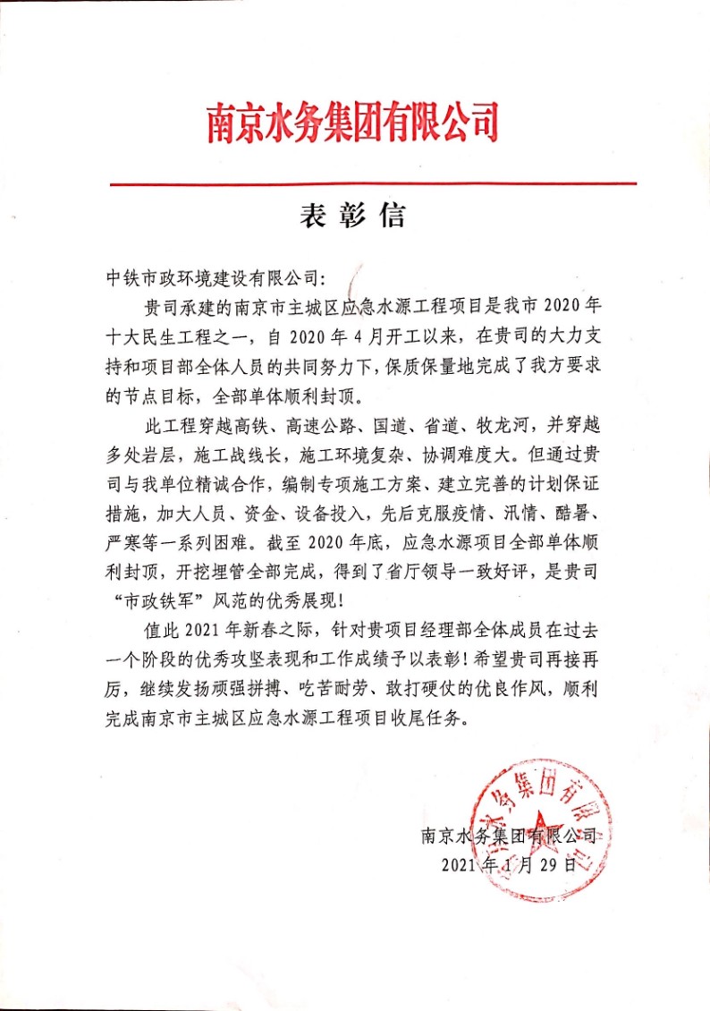 自2020年4月開工以來,南京市主城區應急水源工程項目保質保量完成節點目標,全部單體順利封頂,開挖埋管全部完成。該工程施工戰線長,施工環境復雜、協調難度大,項目部精心編制專項施工方案、建立完善的計劃保證措施,從人員、資金、設備等角度加大投入力度,保證施工進度。該工程在為當地民生事業發展送去便利的同時,也良好地展現了“市政鐵軍”頑強拼搏、吃苦耐勞的精神面貌。為此,南京水務集團有限公司發來表彰信。