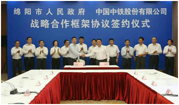 8月31日,股份公司與綿陽市人民政府舉行戰略合作框架協議簽約儀式。中國中鐵股份有限公司副總裁劉輝,綿陽市委副書記、市長劉超見證簽約并致辭。